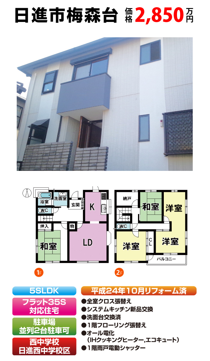 【物件概要】■所在地/日進市梅森台3丁目29-2 ■交通/くるりんバス『梅森台』停徒歩3分 ■土地面積/169.37㎡ ■建物面積/128.34㎡ ■構造/木造2階スレート瓦葺 ■築年月/平成7年3月築 ■用途地域/第1種低層住居専用地域 ■建ぺい率/60% ■容積率/200% ■接道/北側4mに間口6.3m ■現況/空家 ■引渡/即日 ■駐車場2台可 ■販売価格/2,850万円 ■取引形態/仲介