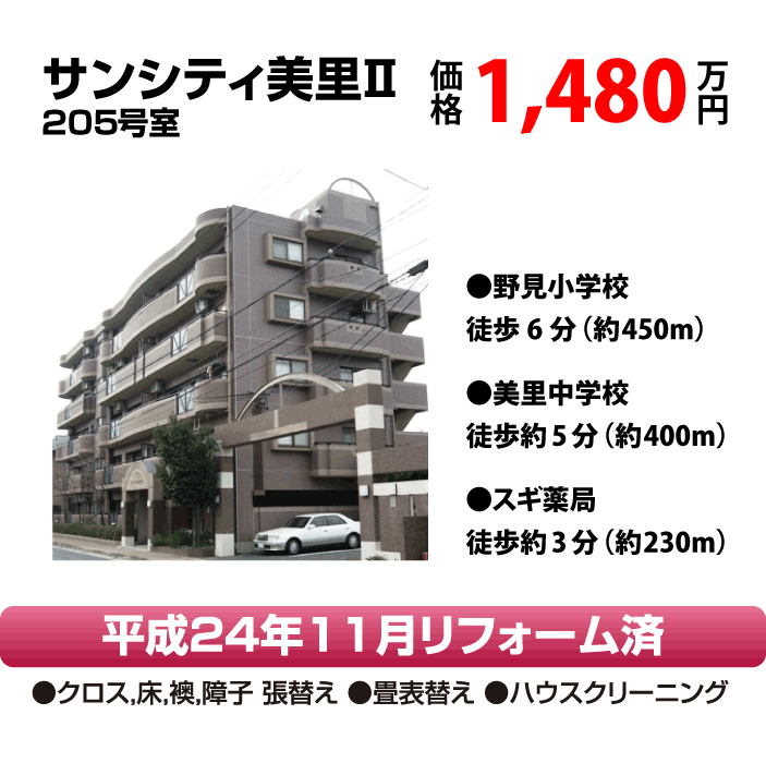 【物件概要】■豊田市美里5丁目17-15 サンシティ美里Ⅱ 205号室 ■ 名鉄バス「神池町」停 徒歩7分 ■ 専有/63.28㎡ ■ 5階建2階 ■ バルコニー/16.75㎡ ■ 1994年09月築 ■ 管理修繕費21,600円/月 ■ 管理人巡回